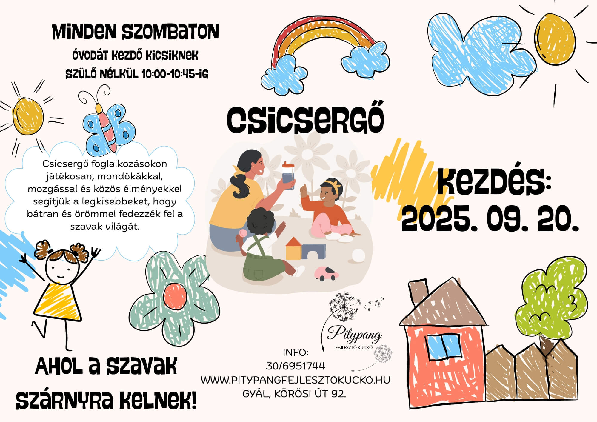 Csicsergő foglalkozásokon játékosan, mondókákkal, mozgással és közös élményekkel segítünk a legkisebbeknek, hogy bátran és örömmel fedezzék fel a szavak világát