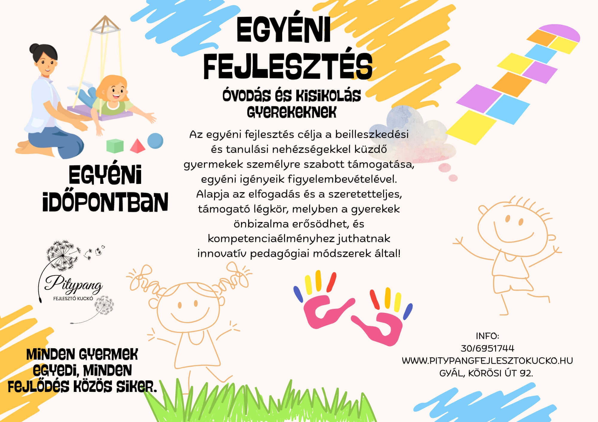 Az egyéni fejlesztés célja a különböző beilleszkedési és/vagy tanulási nehézségekkel küzdő gyermekek személyre szabott megsegítése az egyéni sajátosságok és különleges igények figyelembevételével.