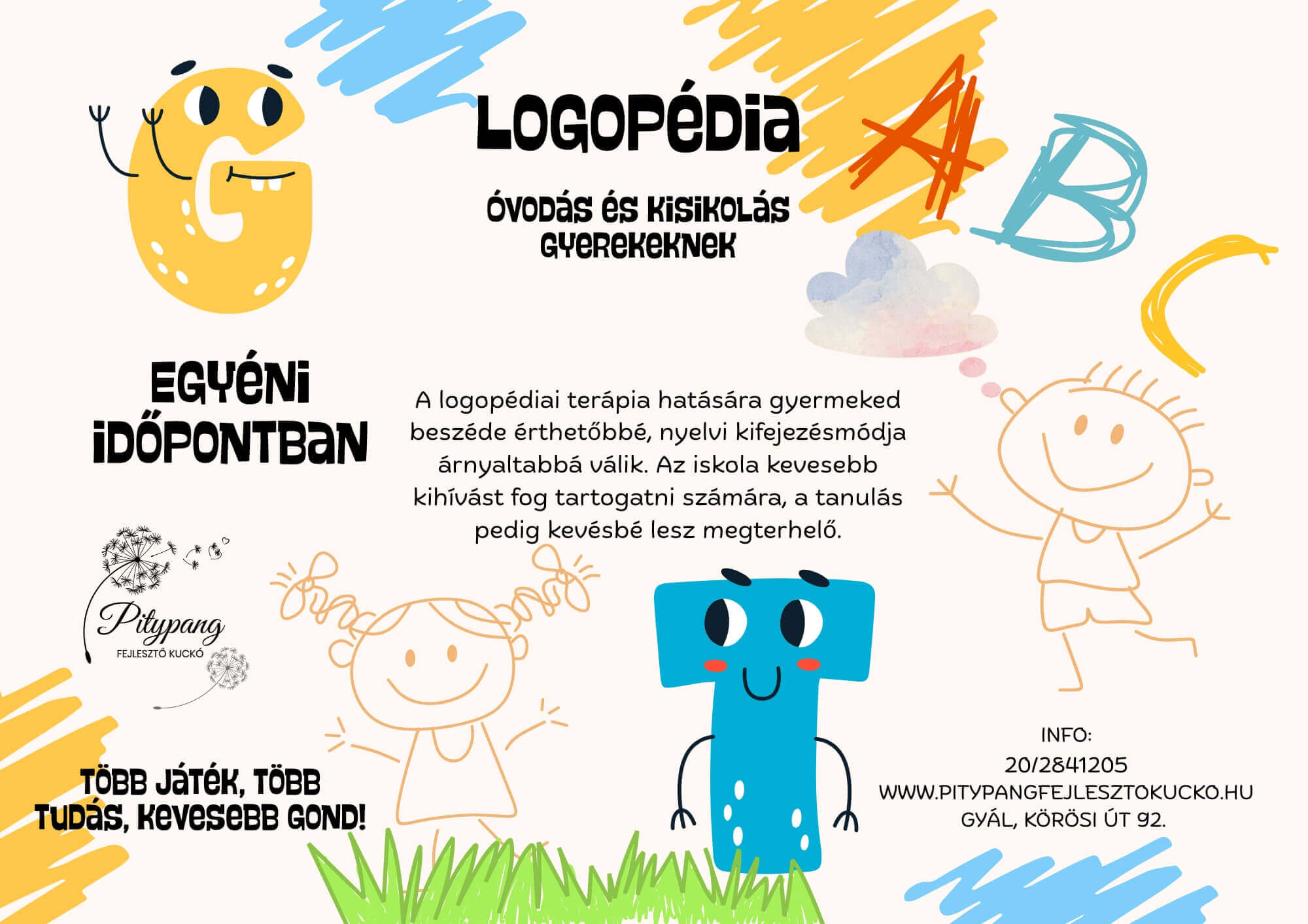 A logopédiai terápia hatására gyermeked beszéde érthetőbbé, nyelvi kifejezésmódja árnyaltabbá válik. Az iskola kevesebb kihívást fog tartogatni számára, a tanulás pedig kevésbé lesz megterhelő. Az egyéni szervezésű foglalkozásokon lehetőség van minden gyermek egyéni szükségleteire és tudására építeni, ami nagyban hozzájárul a logopédiai terápiák sikeréhez.
