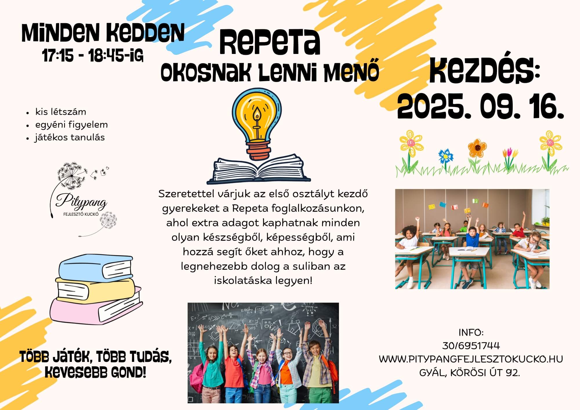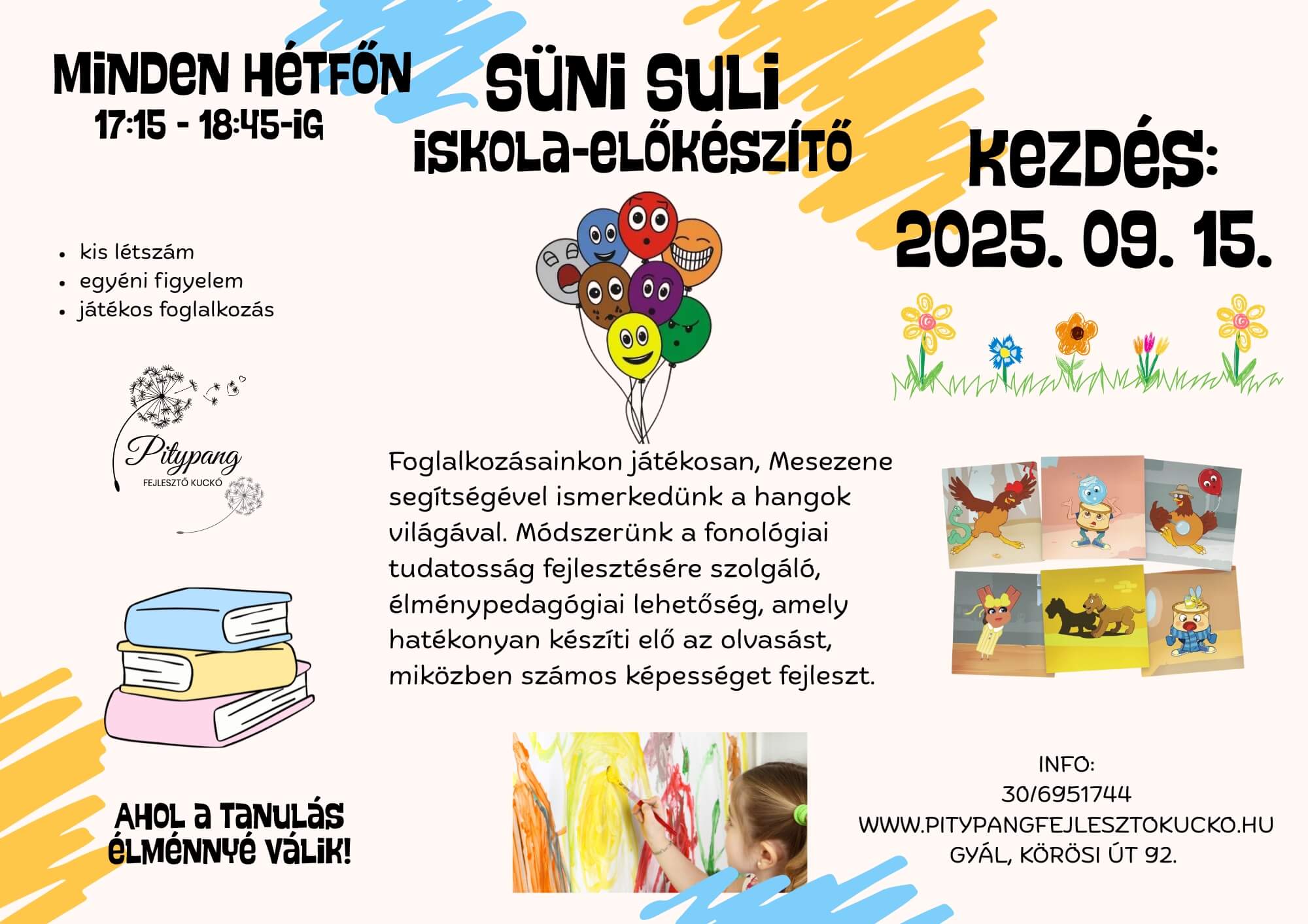 A foglalkozásokon komplex fejlesztés zajlik, kis létszámban, egyénre szabottan. A feladatokon keresztül fejlődik a gyermekek problémamegoldó képessége és kreatív gondolkodása. A felkészítés során nagy hangsúlyt kapnak a különböző részképességek, valamint a mozgásos tevékenységek.